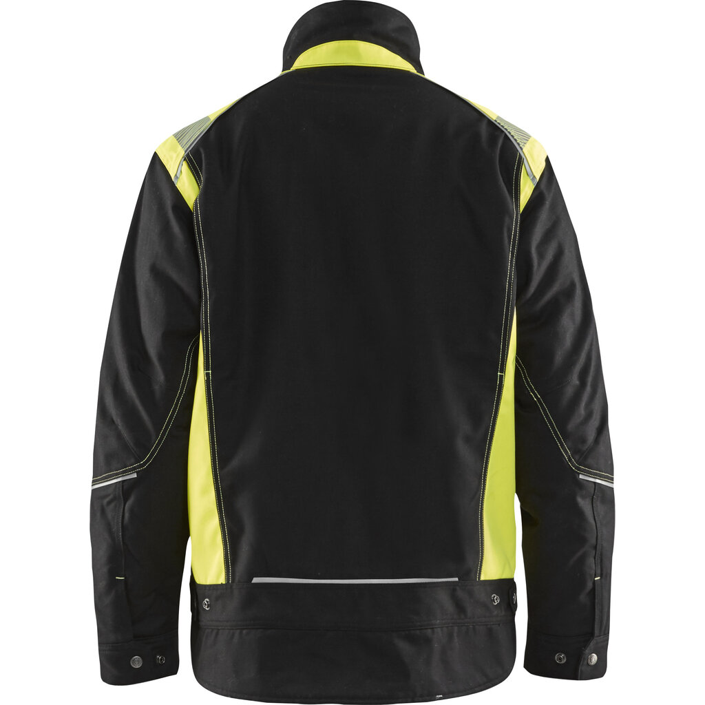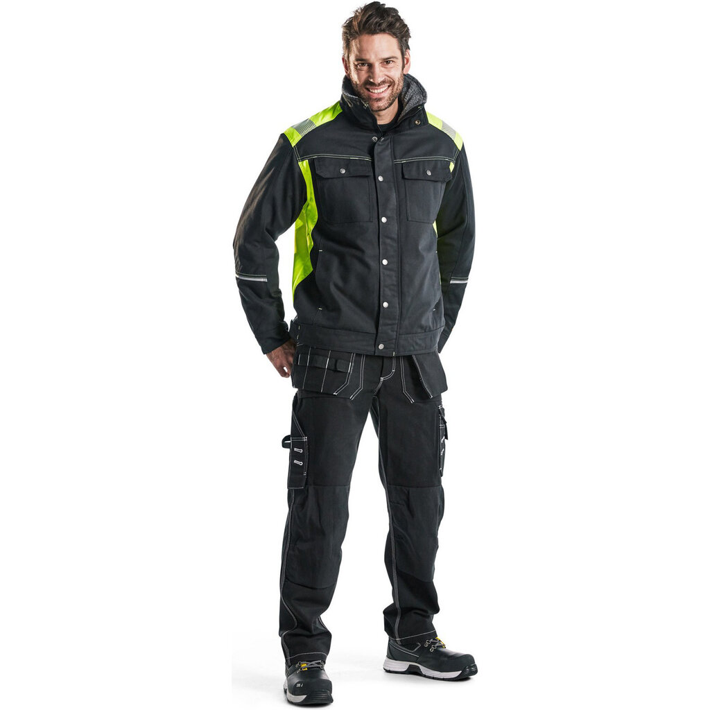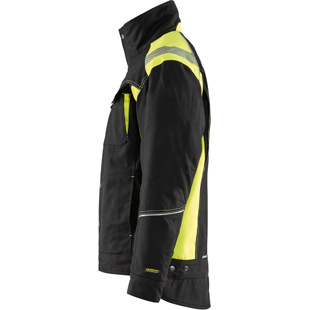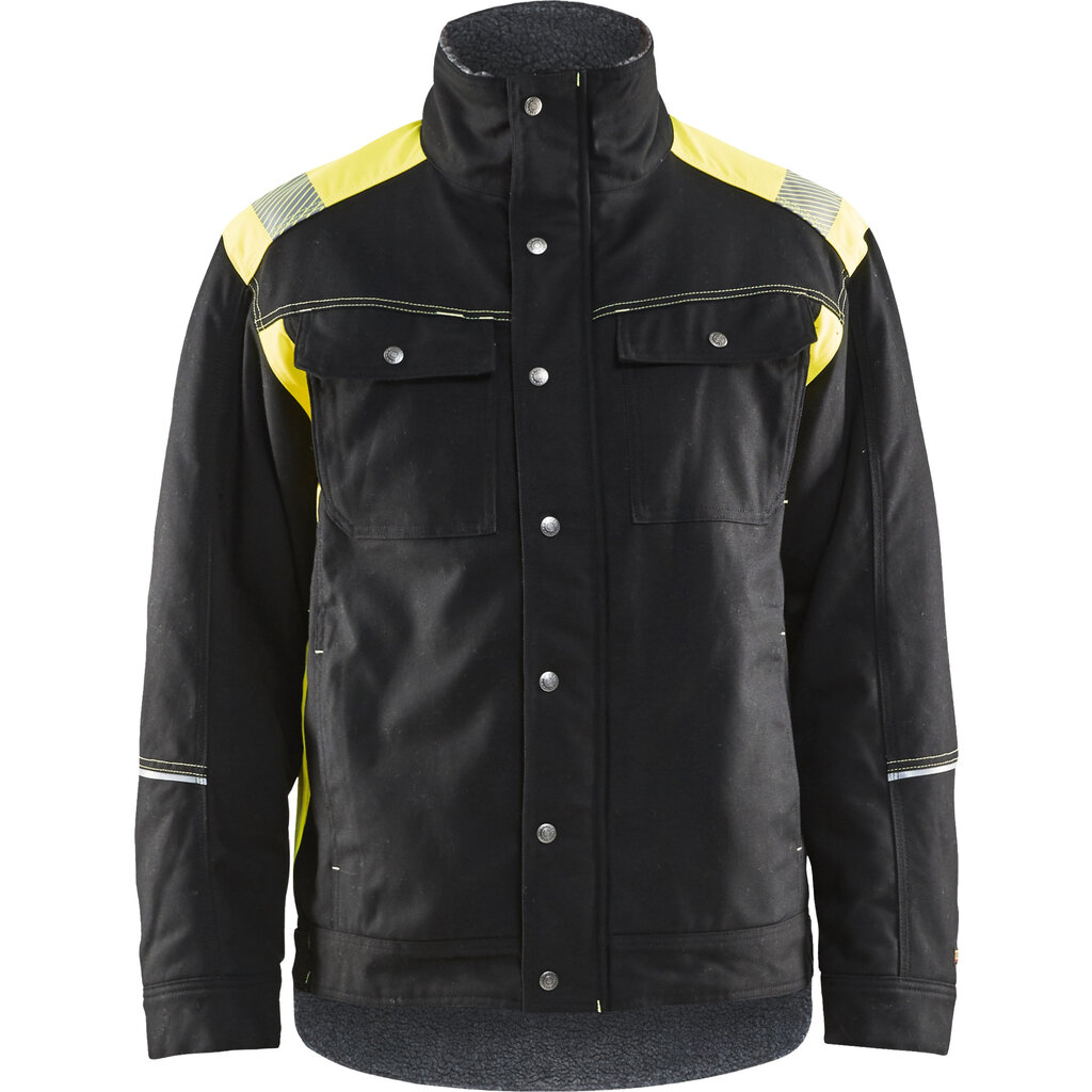 Mooie winterjas van Blaklader met zwarte spijkerjack look en fluor gele en reflecterende details.