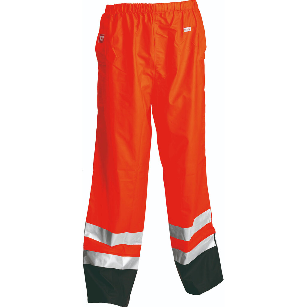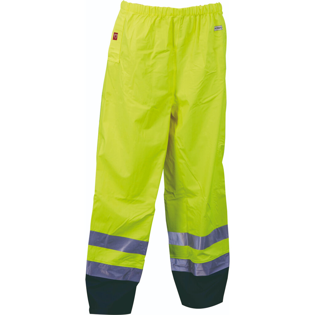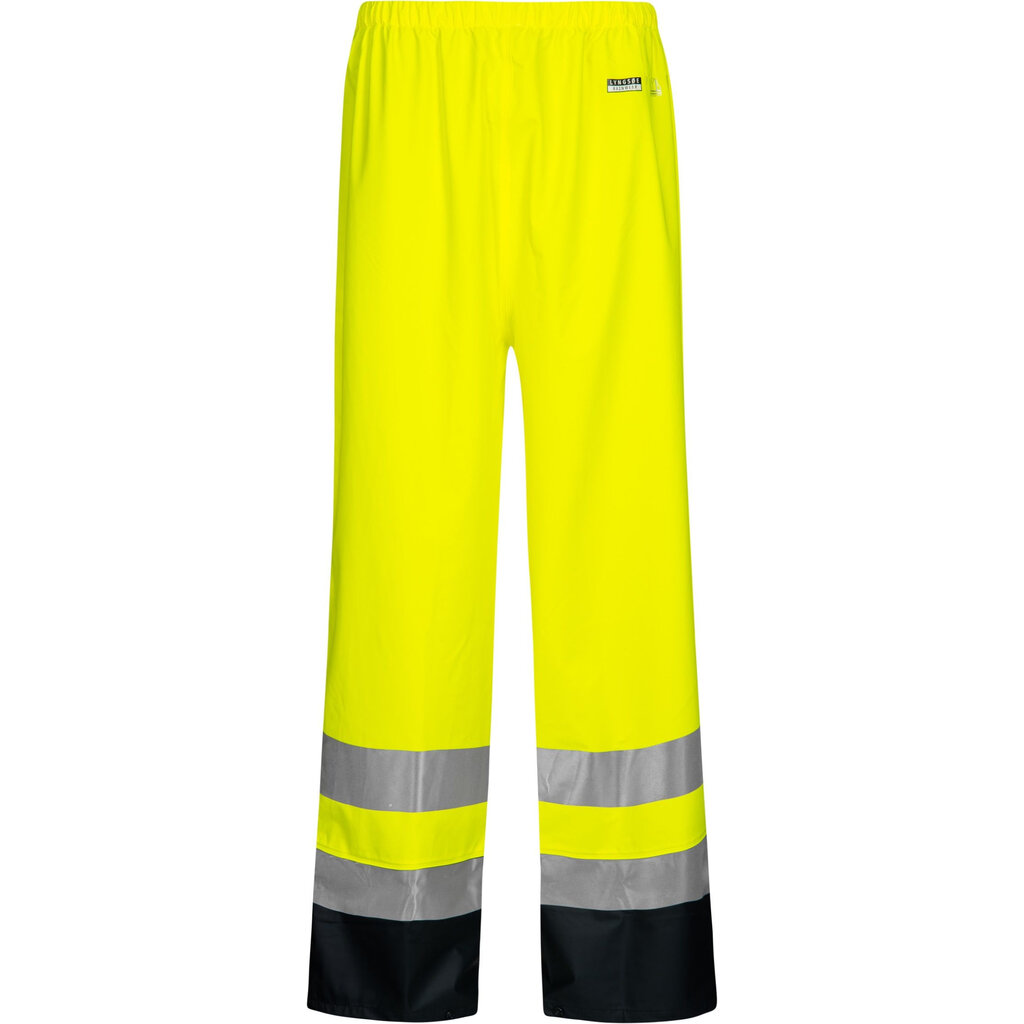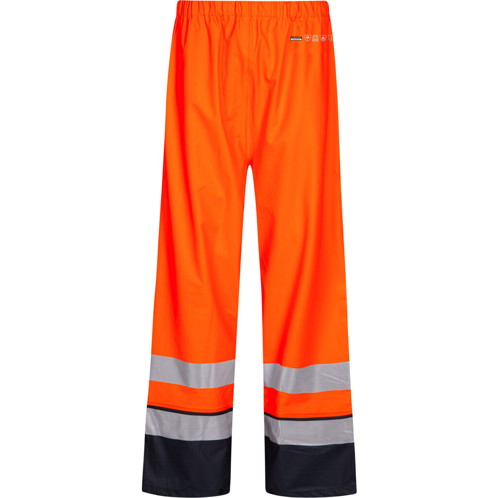 Antistatische regenbroek, vlamvertragend en high visibility. Van het merk Lyngsøe, leverbaar in twee kleurcombinaties: geel / marine of oranje / marine.