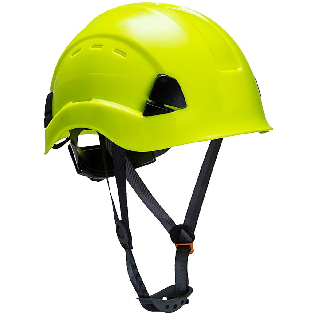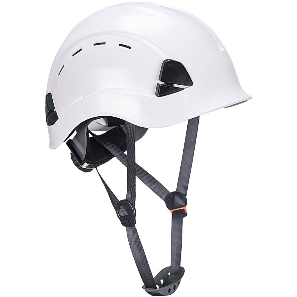 Veiligheidshelm met driepuntssluiting en ventilatiegaten voor extra draagcomfort.
