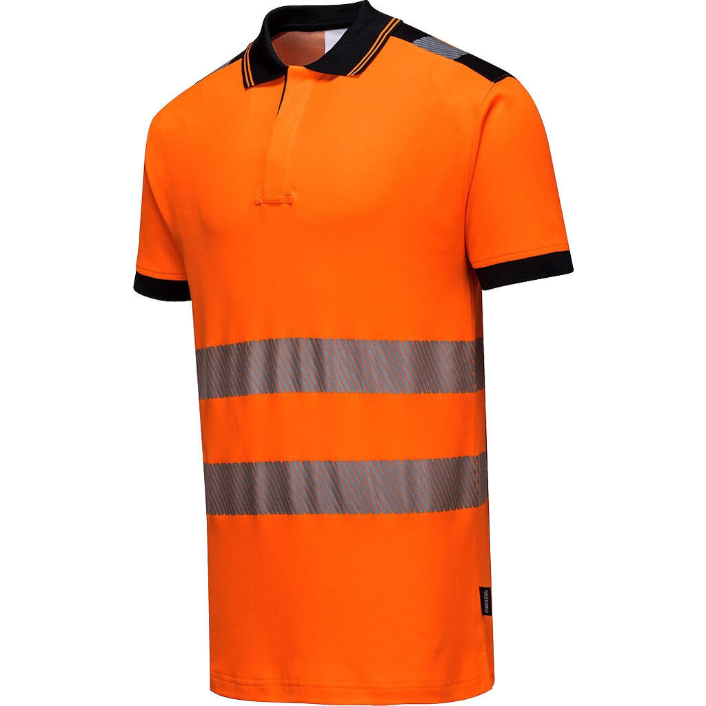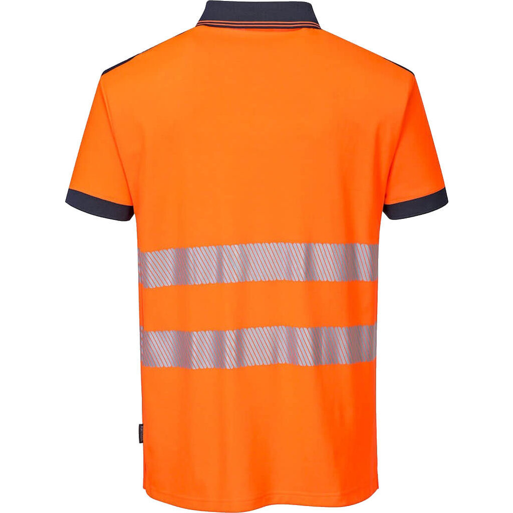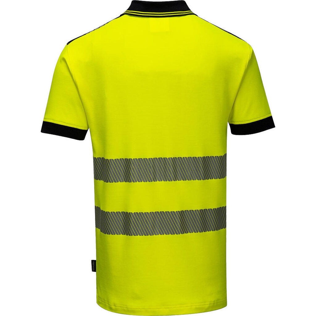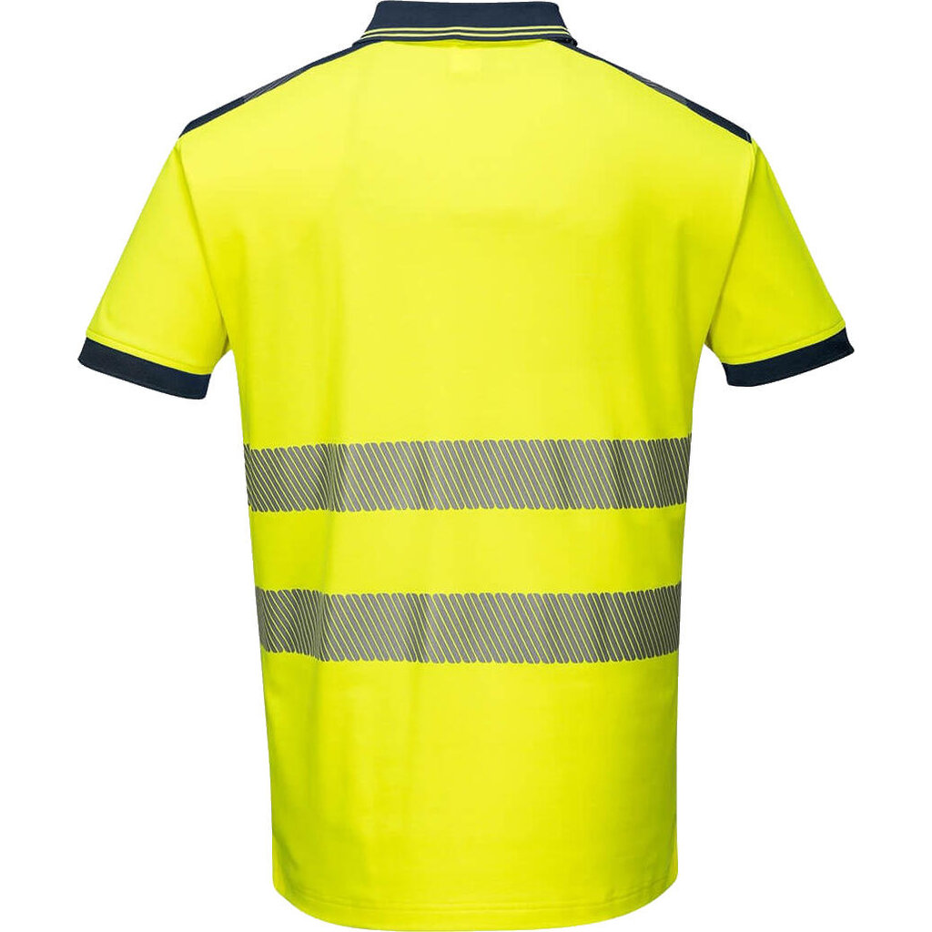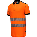Portwest hoge zichtbaarheidspolo, model T180. Dit poloshirt van ademend, premium comfortmateriaal (gebreid katoen en polyester) geeft veel bewegingsvrijheid. Verkrijgbaar in twee fluorescerende kleuren met marineblauwe en zwarte details.