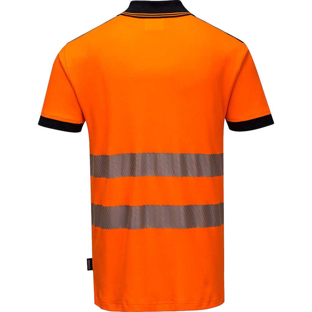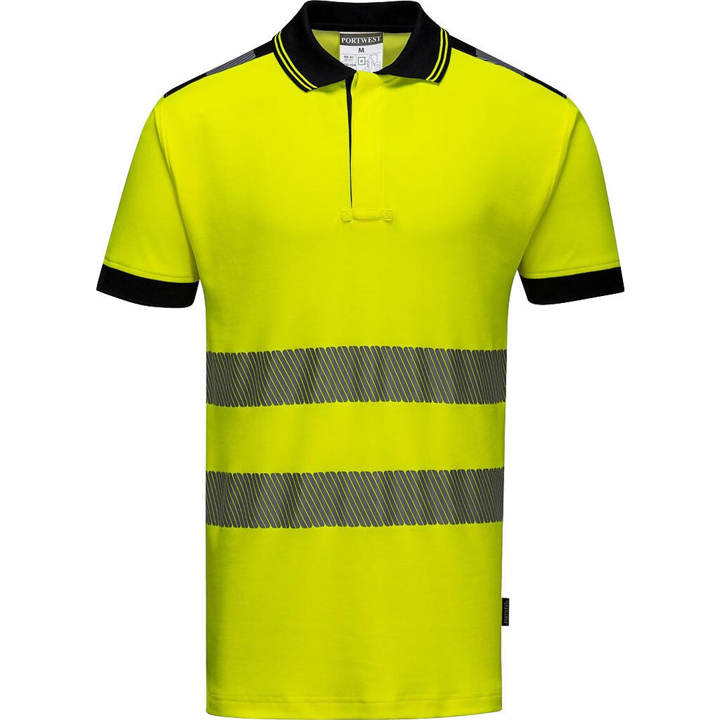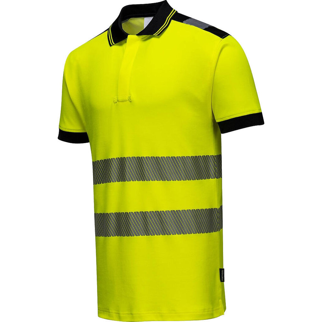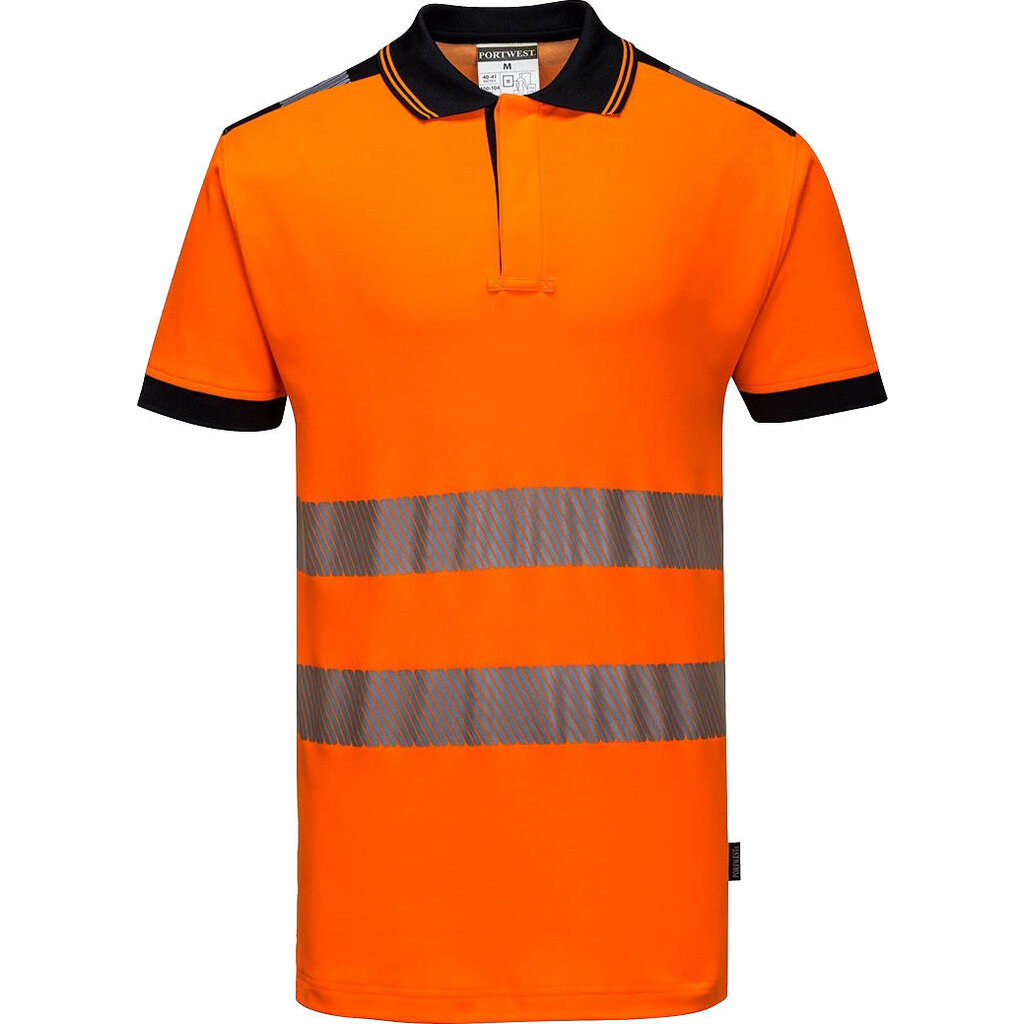 Portwest hoge zichtbaarheidspolo, model T180. Dit poloshirt van ademend, premium comfortmateriaal (gebreid katoen en polyester) geeft veel bewegingsvrijheid. Verkrijgbaar in twee fluorescerende kleuren met marineblauwe en zwarte details.