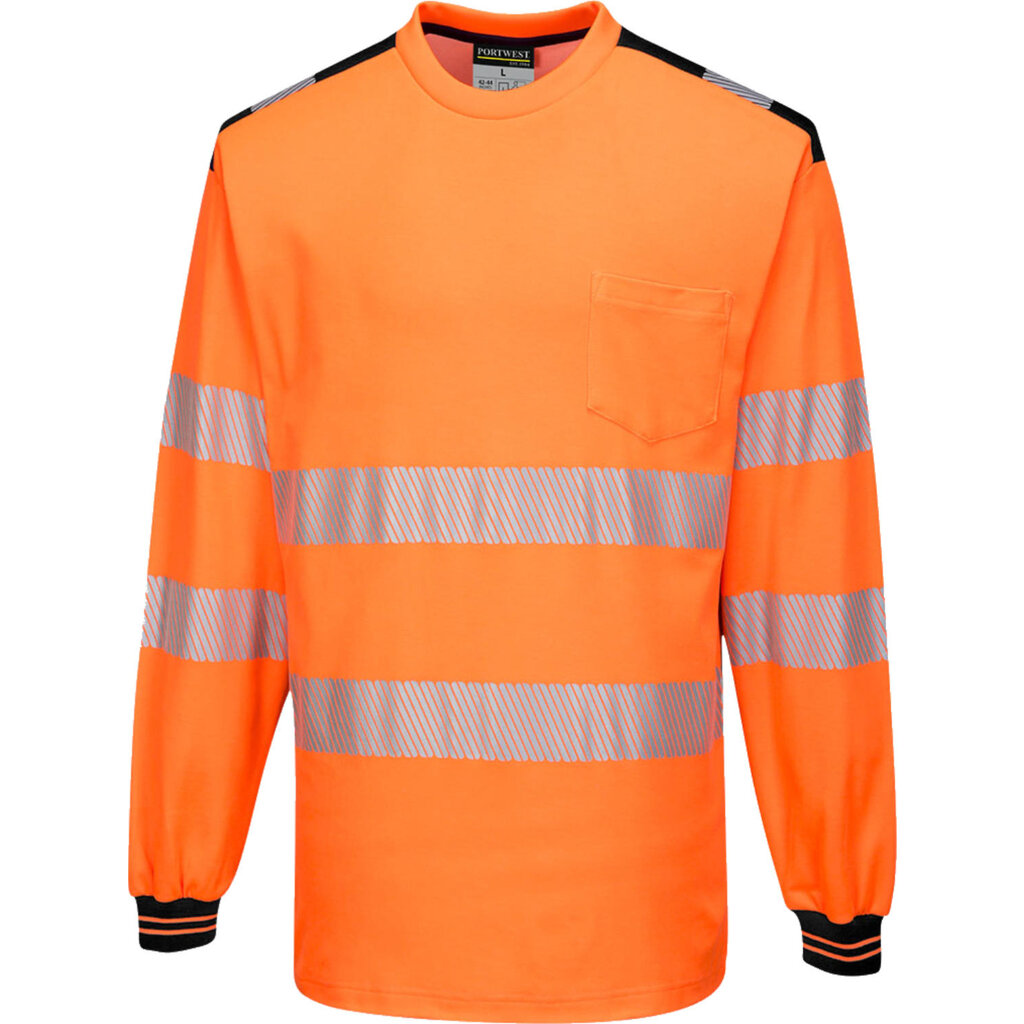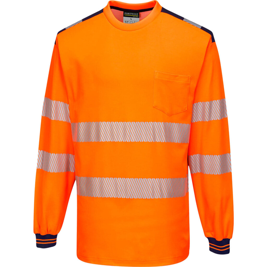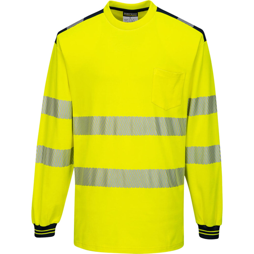 Portwest Hi-Vis shirt, model T185. Dit lichtgewicht T-shirt van katoen/polyester komt in twee fluorescerende kleuren, met mouw- en schouderbanden in marineblauw of zwart. Functioneel is het identiek aan de T181, maar met lange mouwen.