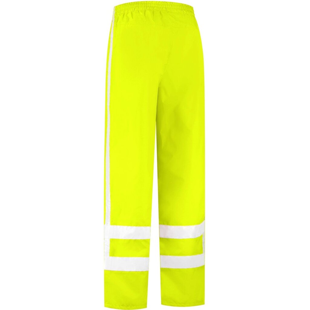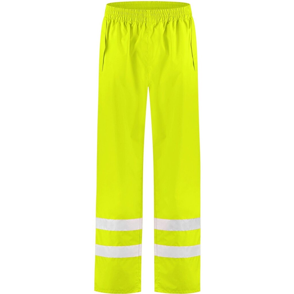 Deze regenpantalon is gemaakt van hoogwaardig Oxford polyester, een materiaal dat bekend staat om zijn duurzaamheid en uitstekende waterafstotende eigenschappen. Dankzij de fluorescerende gele kleur en de strategisch geplaatste reflectiebanden ben je zelfs bij zware regenval of in de schemering van grote afstand zichtbaar. Het ontwerp van deze overbroek is gericht op gemak: door de elastische tailleband trek je de broek moeiteloos over je gewone werkkleding aan. Aan de onderzijde van de pijpen vind je handige drukknopen, zodat de broek altijd goed aansluit op je veiligheidslaarzen of werkschoenen en er geen water naar binnen sijpelt. Met dit kledingstuk kies je voor een combinatie van comfort, droogte en maximale veiligheid.