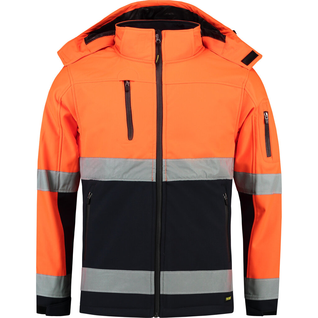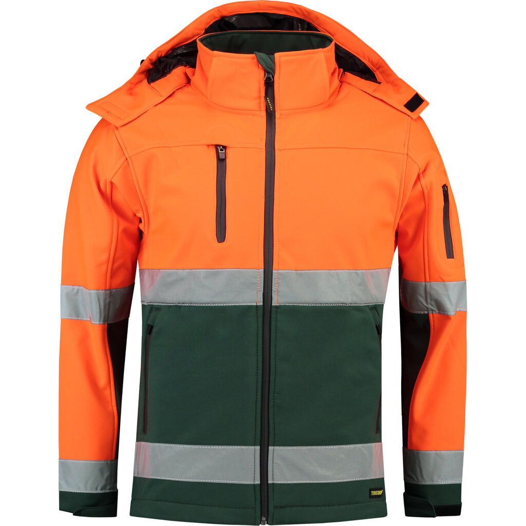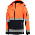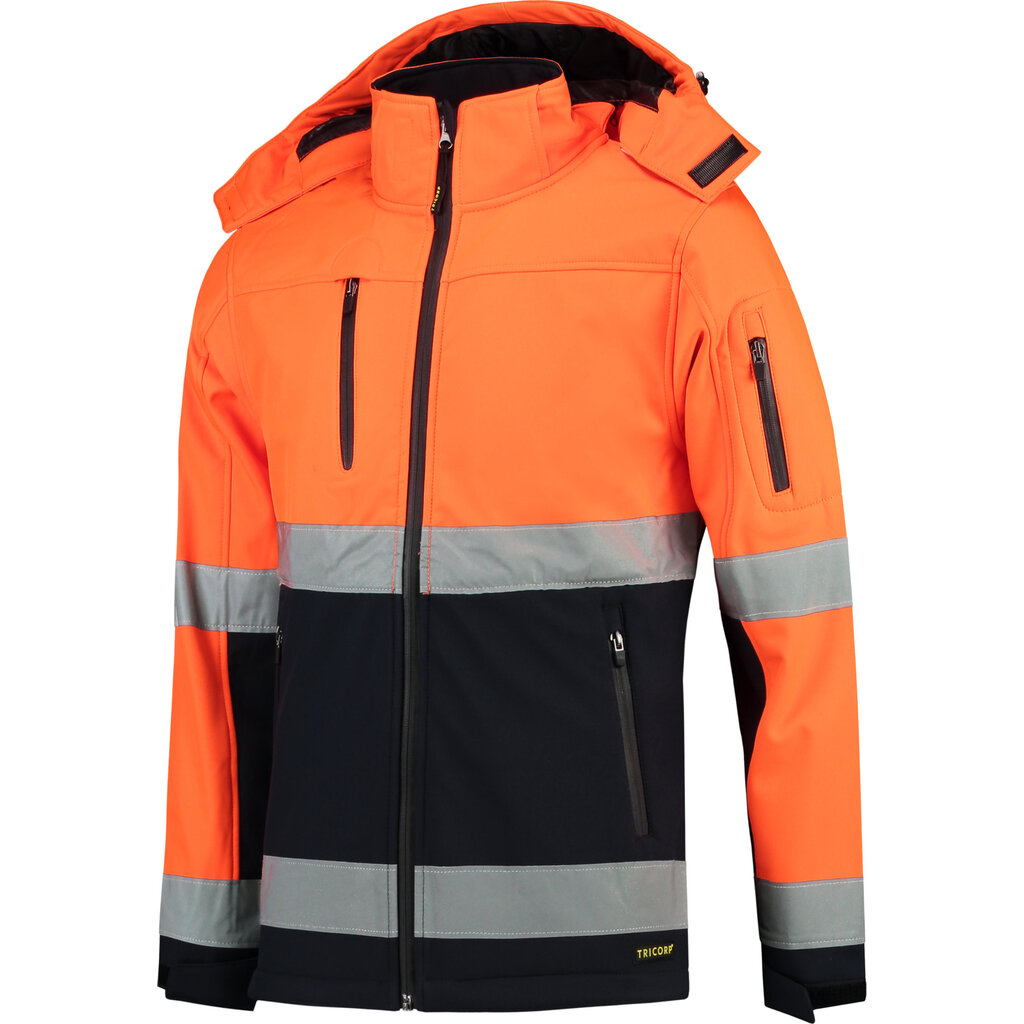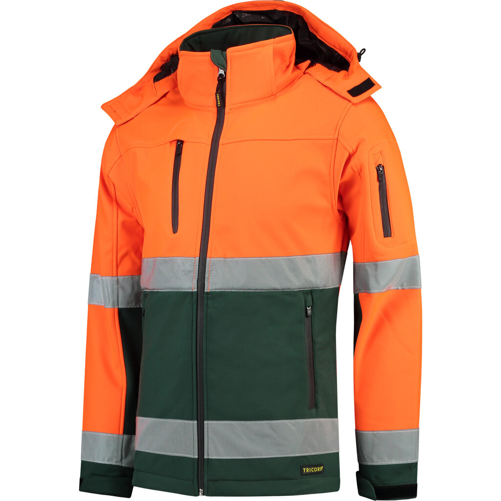 Bi-color softshell jas van Tricorp model TSE3001 (403007). Leverbaar in drie kleurencombinaties: geel met blauw of oranje met blauw of groen. Hoogstaande kwaliteit werkjas met een mooie pasvorm.