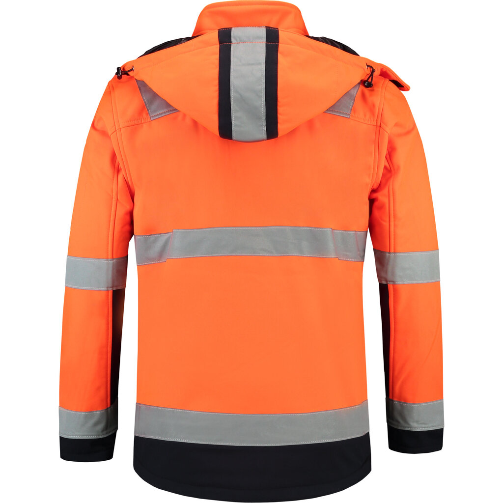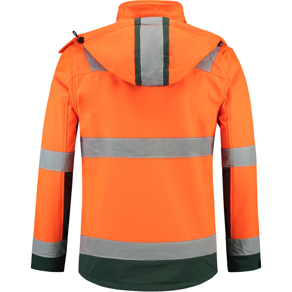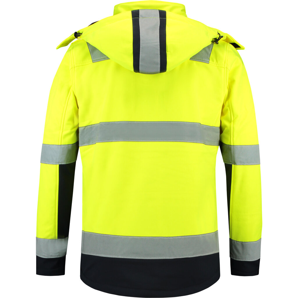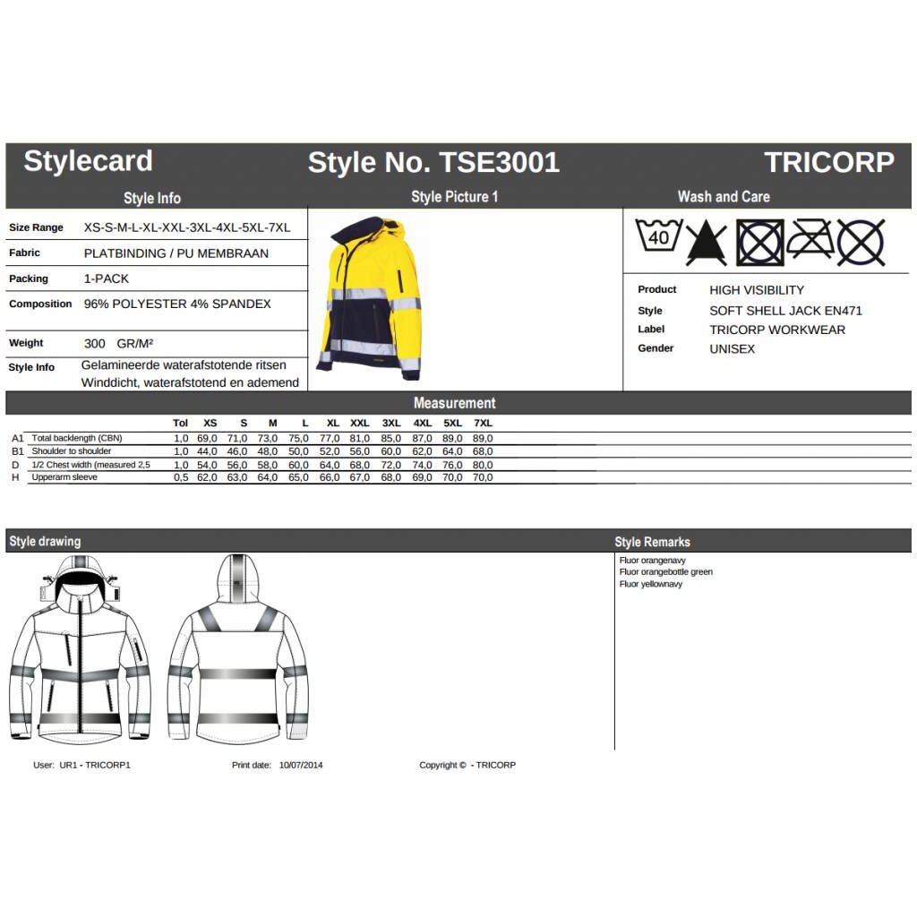 Bi-color softshell jas van Tricorp model TSE3001 (403007). Leverbaar in drie kleurencombinaties: geel met blauw of oranje met blauw of groen. Hoogstaande kwaliteit werkjas met een mooie pasvorm.