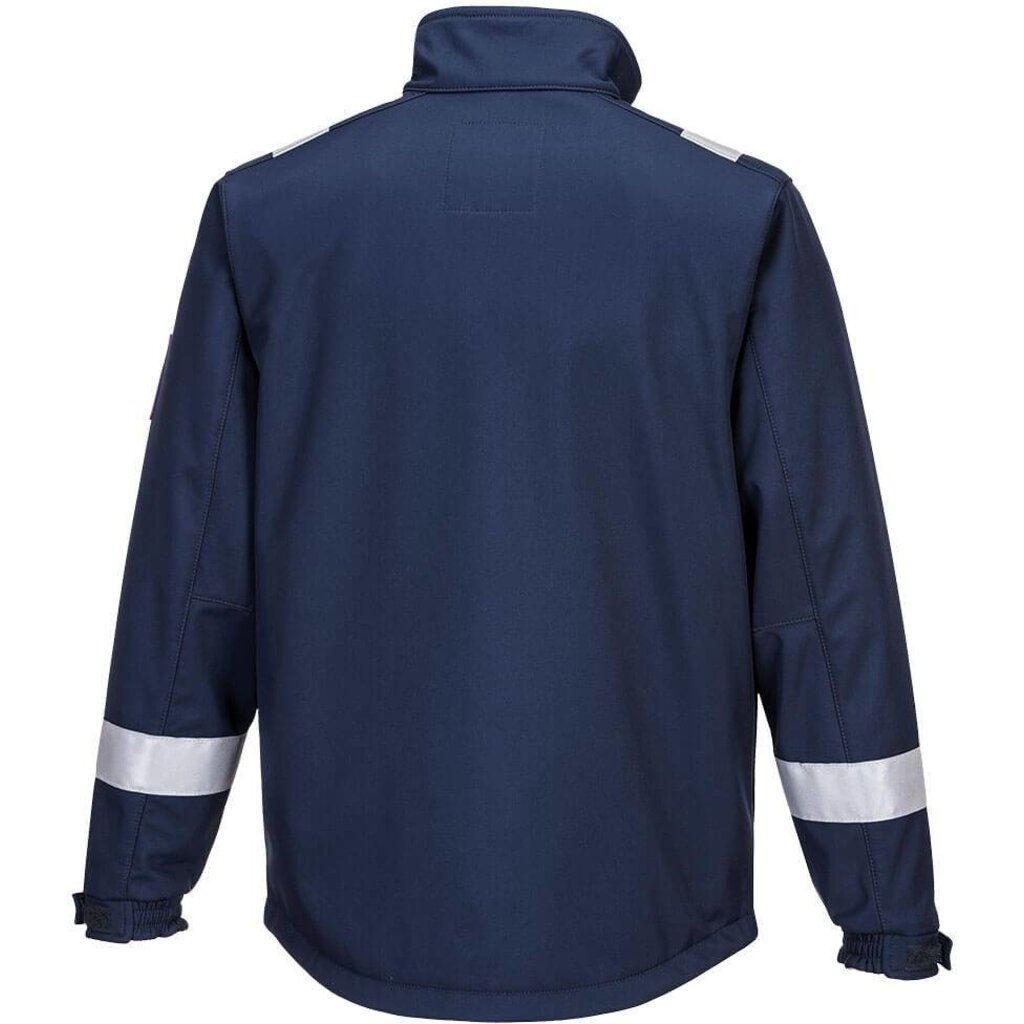 Vlamvertragend softshell jack met verdekte rits en drukknopen aan voorzijde. Tevens antistatisch, vlamboogwerend en beschermt bij lassen en tegen vloeibare chemicaliën.