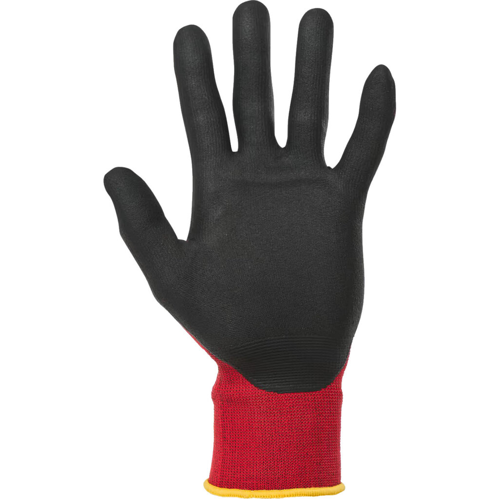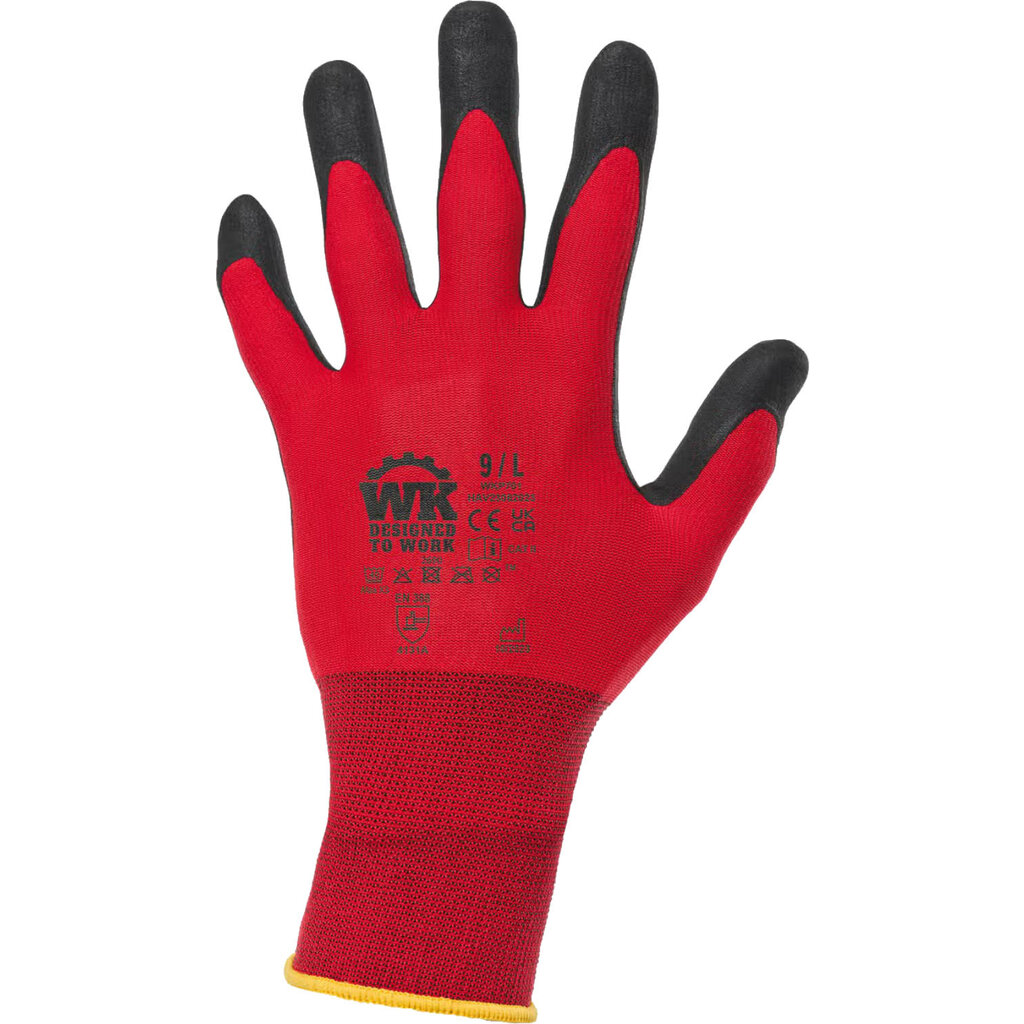 De WK. Designed To Work WKP701 werkhandschoenen bieden optimale bescherming voor verschillende soorten werk. Microschuim nitril coating biedt duurzaamheid met bescherming tegen slijtage en olie. Tegelijkertijd behoud je veel bewegingsvrijheid dankzij het ergonomisch ontwerp, gebreid in polyamide en elastaan. Ideaal voor precisiewerk! Dankzij het elastische polsboord met elastisch overlockstiksel, in een kleur die varieert per maat, sluiten de handschoenen nauw en kun je je handen vrij bewegen.